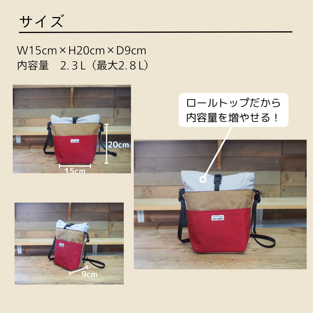 開口部をロールトップタイプにすることで、壊れやすいファスナーを使用せず、バッグそのものを永く使えるように、という想いで設計しました。