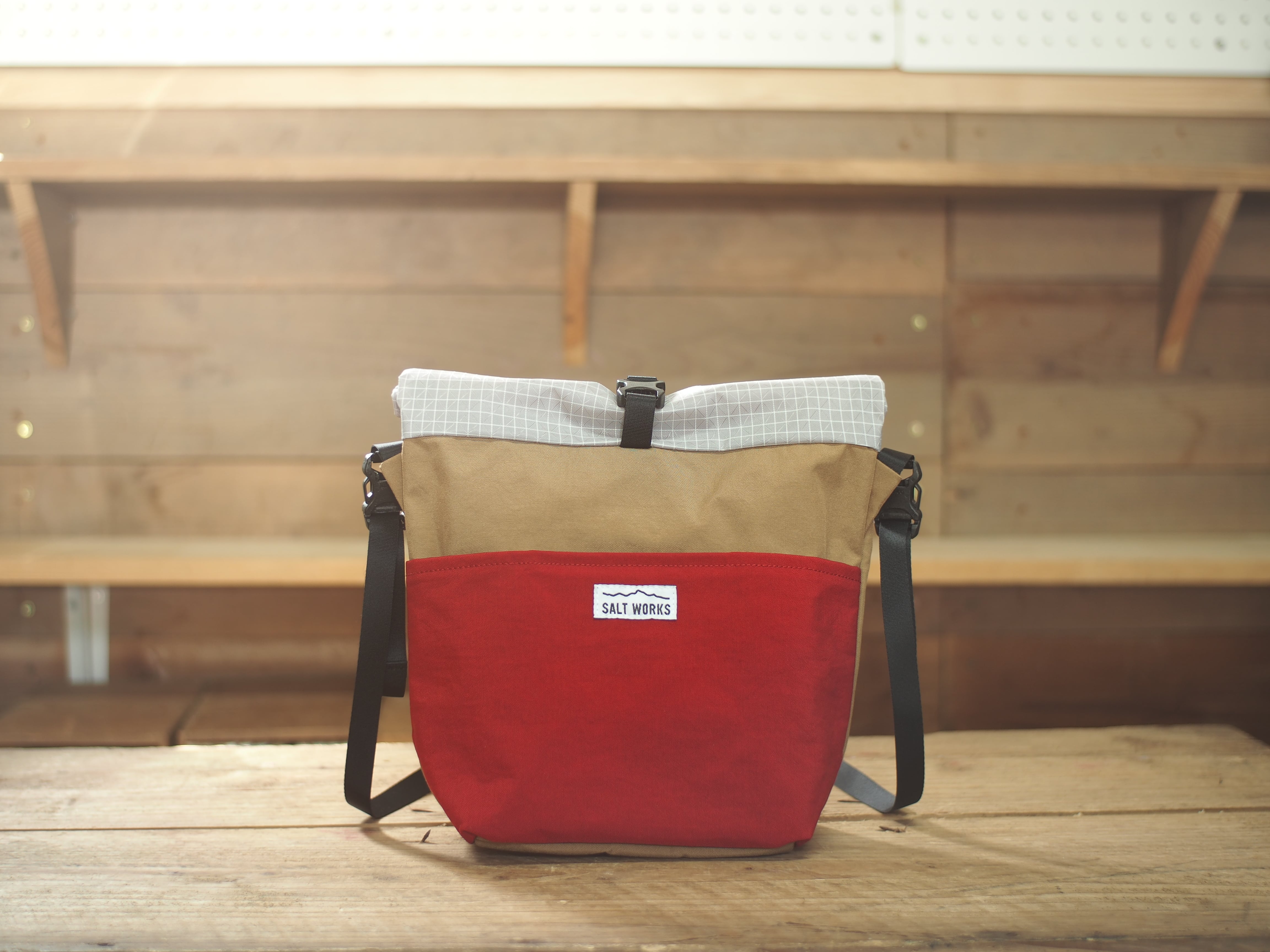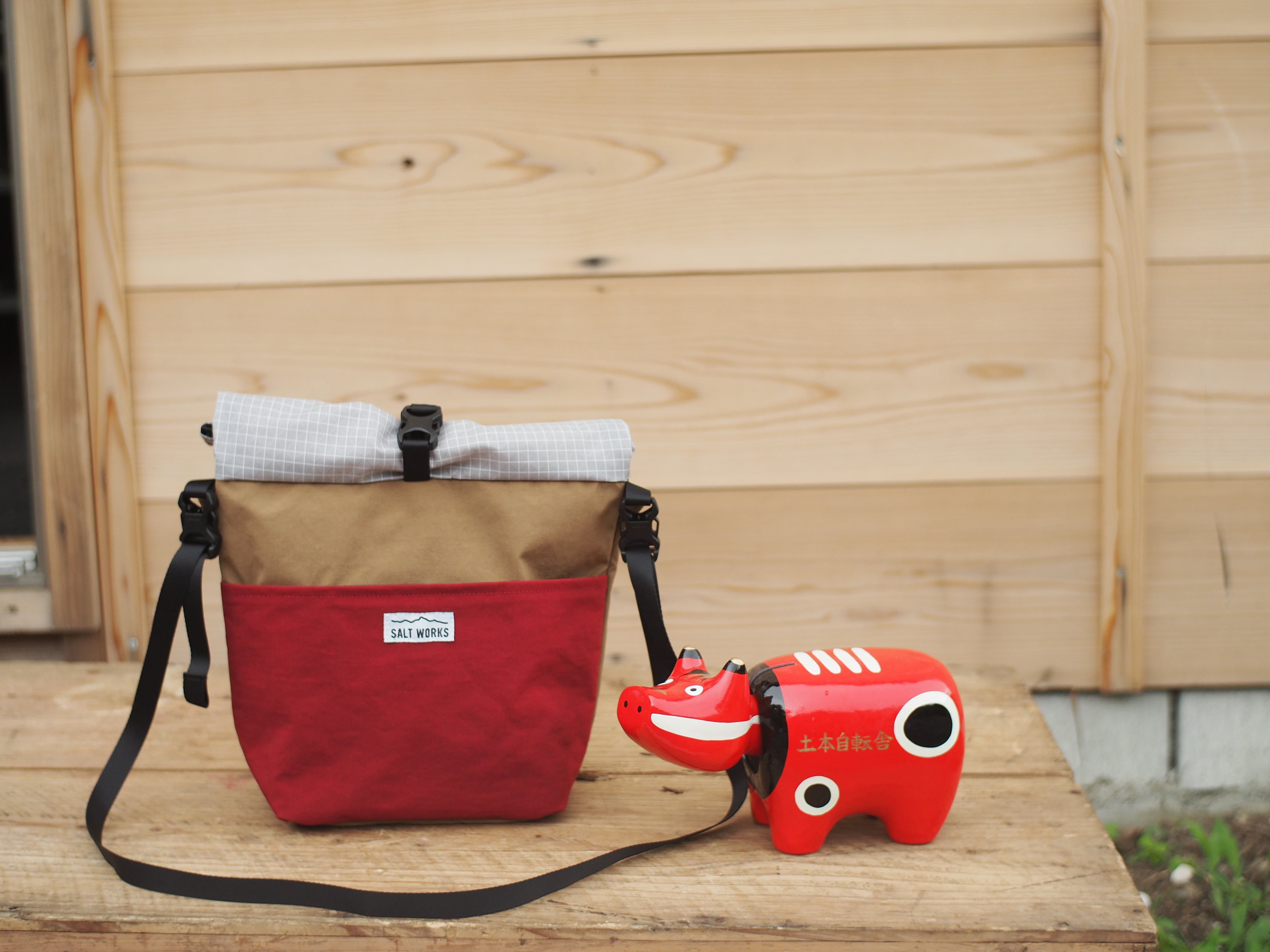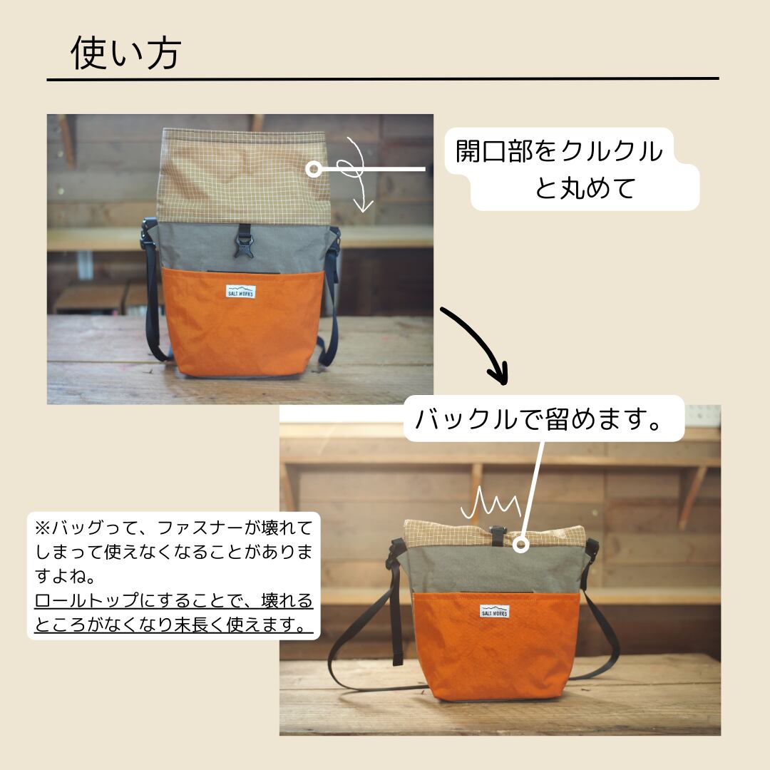 開口部をロールトップタイプにすることで、壊れやすいファスナーを使用せず、バッグそのものを永く使えるように、という想いで設計しました。